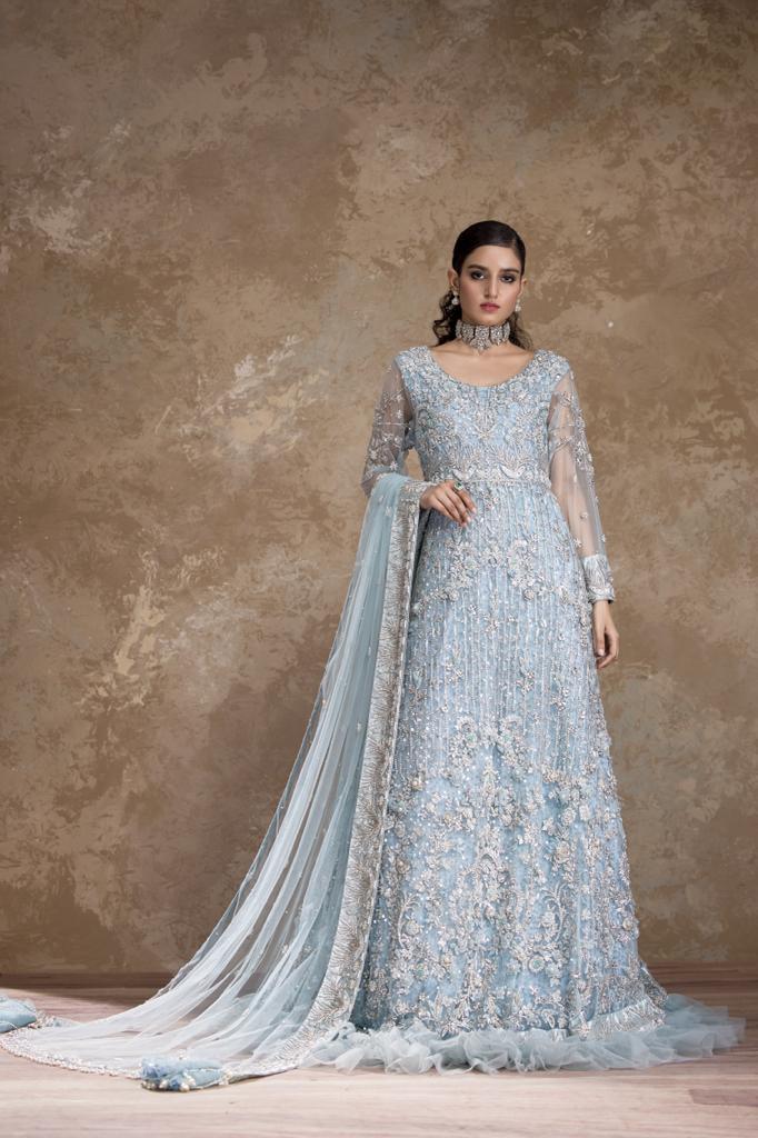 Stupendously fashioned wear in pastel impression depicting a beatific walima bride. bedecked with silver embellishments in distinct techniques enhancing with risham thread work.