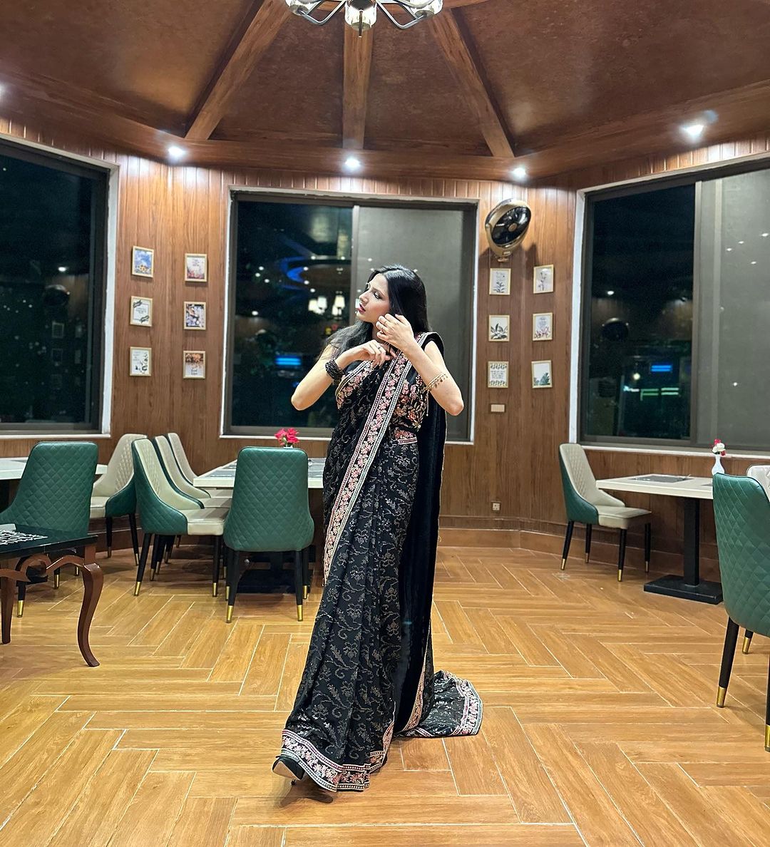 our alluring black saree with miniature embellishment in floral patterns on the borders paired with peachy pink embroidered flowers on the blouse which compliments the black sequenced chiffon